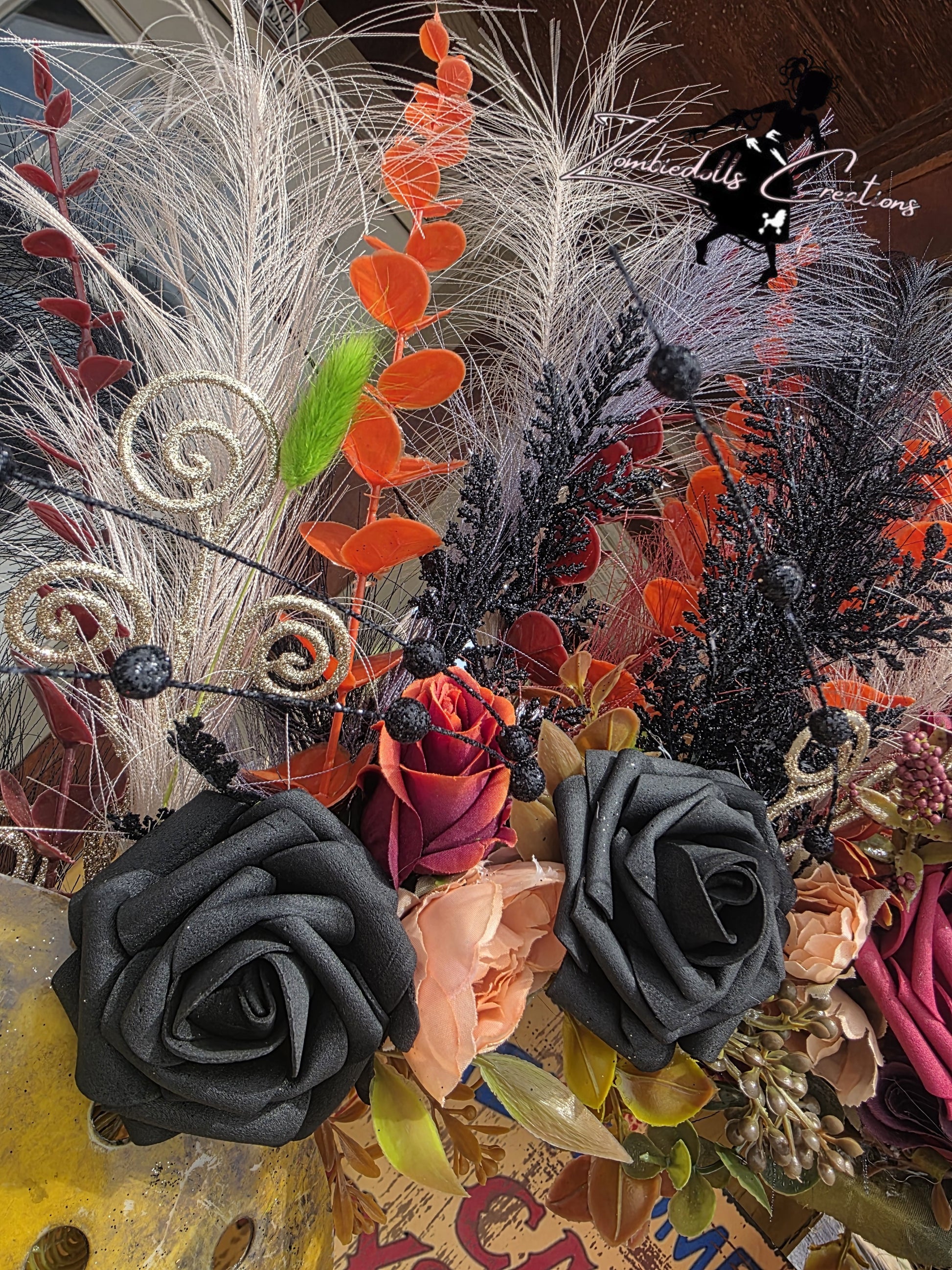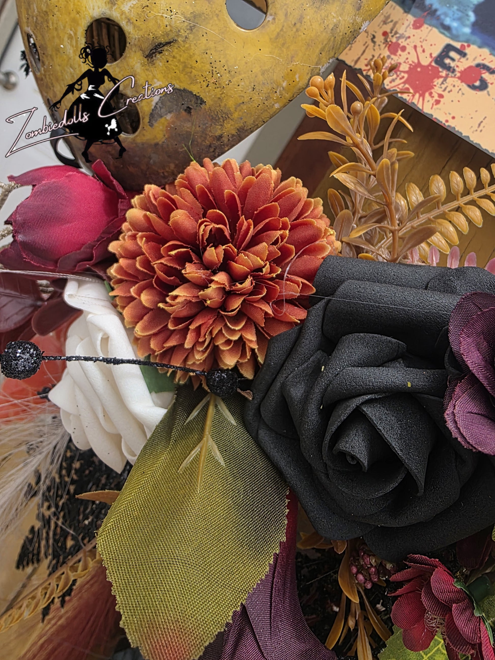 At its center hangs a weathered Jason mask, a chilling icon from the Friday the 13th franchise, surrounded by a rich and moody blend of black roses, deep purple florals, and ivory accents. Twisting spirals, inky eucalyptus, and dramatic black and red feathers reach out from all directions, adding texture, depth, and a raw, wild energy.
