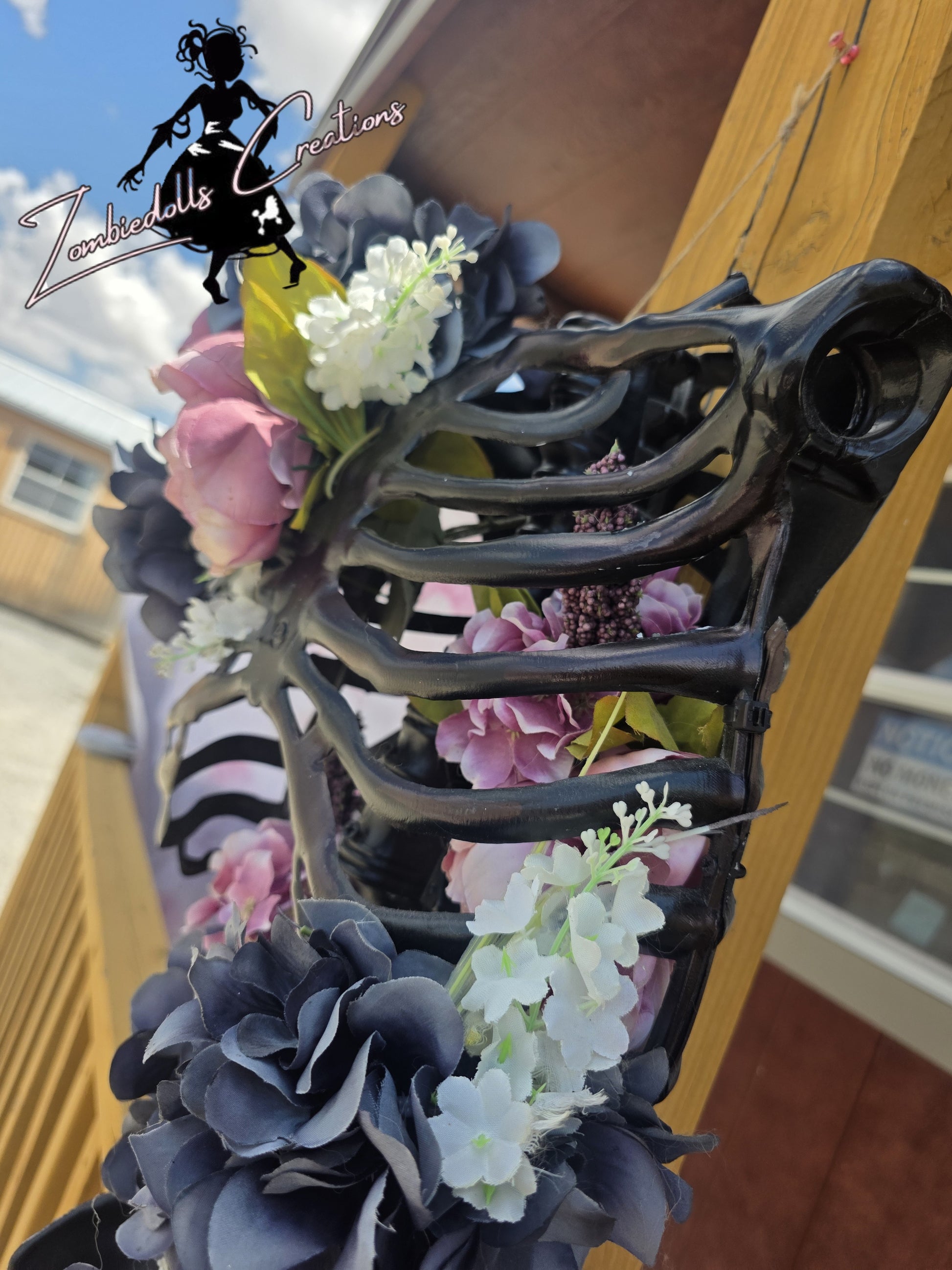 Details: Black ribcage base with spine & hip detail Faux florals in muted, moody tones Handmade, one-of-a-kind design Indoor or outdoor (covered) use